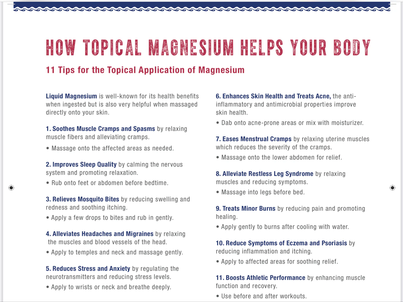 Popular Uses: Improved Sleep Quality, leg cramps, migraines, used as natural and aluminum free deodorant alternative, skin health, restless leg syndrome, mosquito bites and many more!