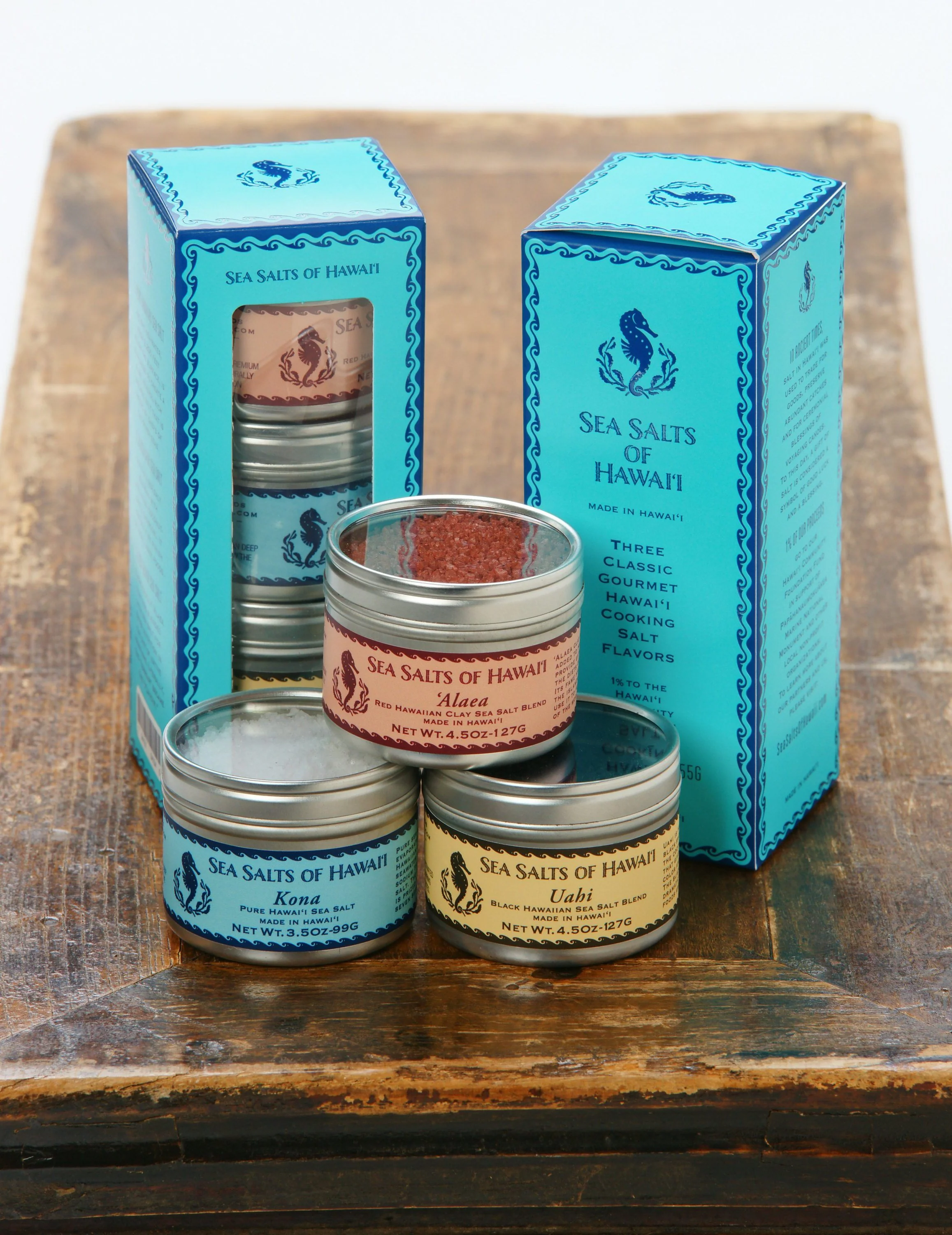 A selection of three tins of our classic flavors: 100% Pure Hawaiian Salt hand harvested from ultra pristine and mineral rich deep ocean waters on our own Kona Salt Farm and Alaea Red and Uahi Black Hawaiian Sea Salt blends from Molokai in a beautiful gift box.